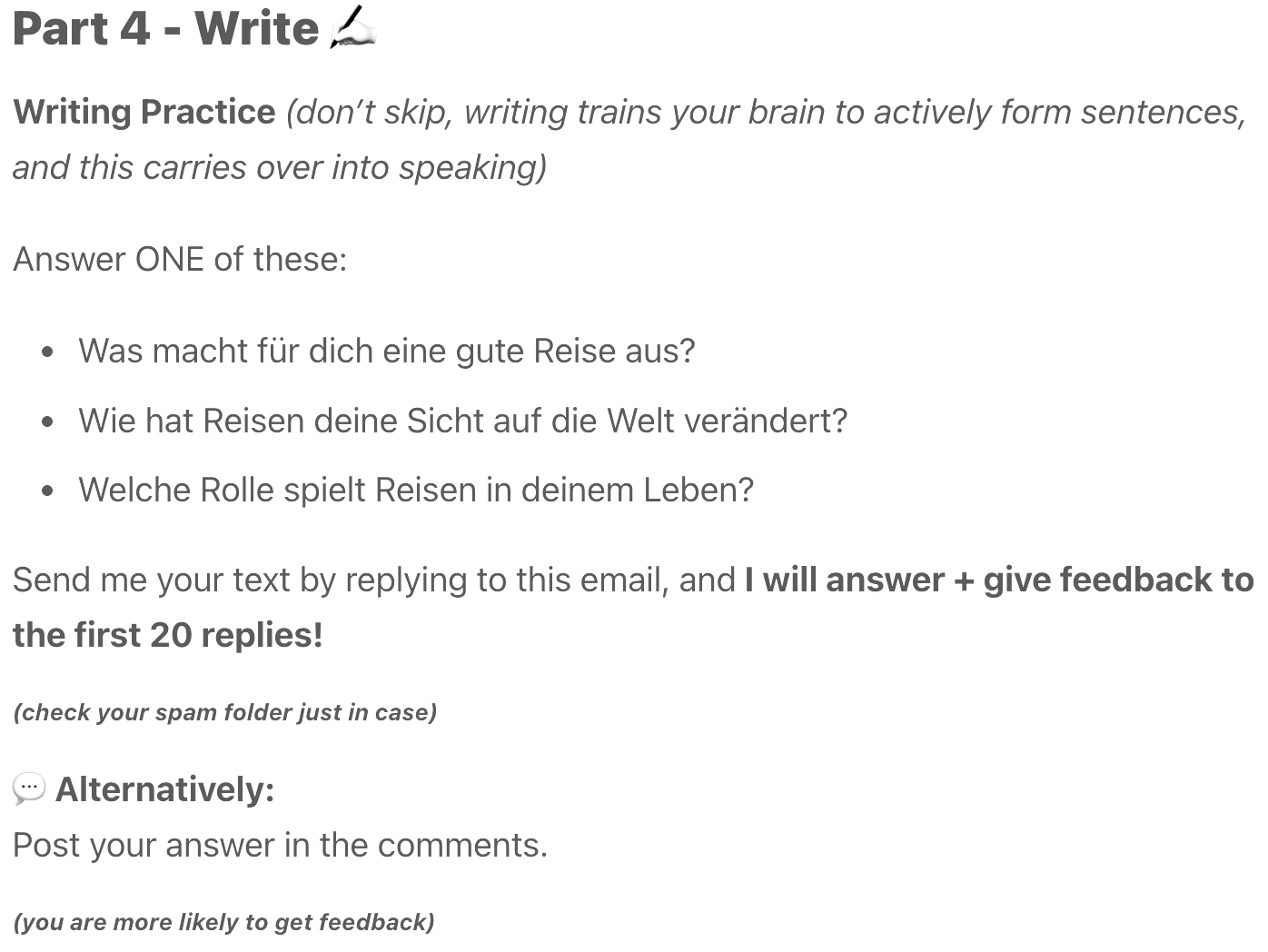 That’s why this system is structured the way it is: you first understand real German (reading & listening), then you actively produce it (writing), and finally you use it in real-time situations (speaking). This sequence mirrors how fluency actually develops.
