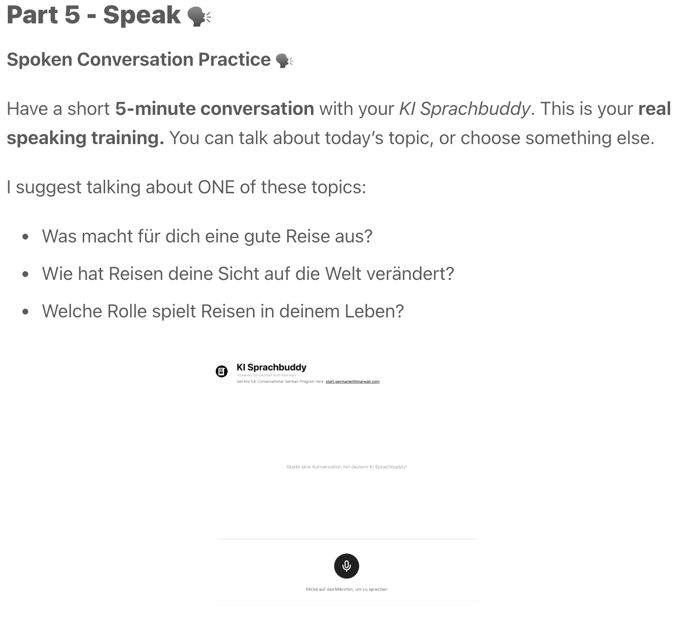 New: You speak with the newly developed KI Sprachbuddy, an AI conversation tool that is designed to help you specifically with conversational German.